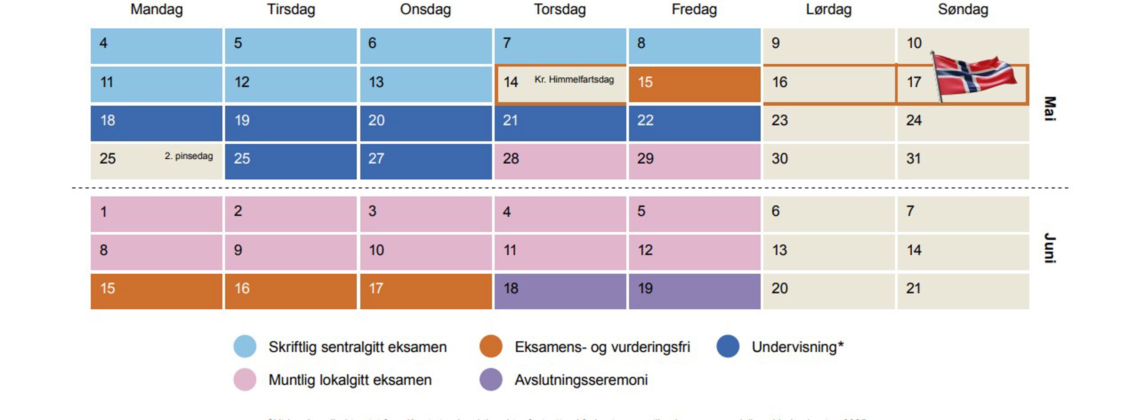 Representantar for alle fylkeskommunane har laga ei felles nasjonal ramme for eksamensavviklinga i 2026. Den felles planen viser disponeringa av tida i mai og juni.